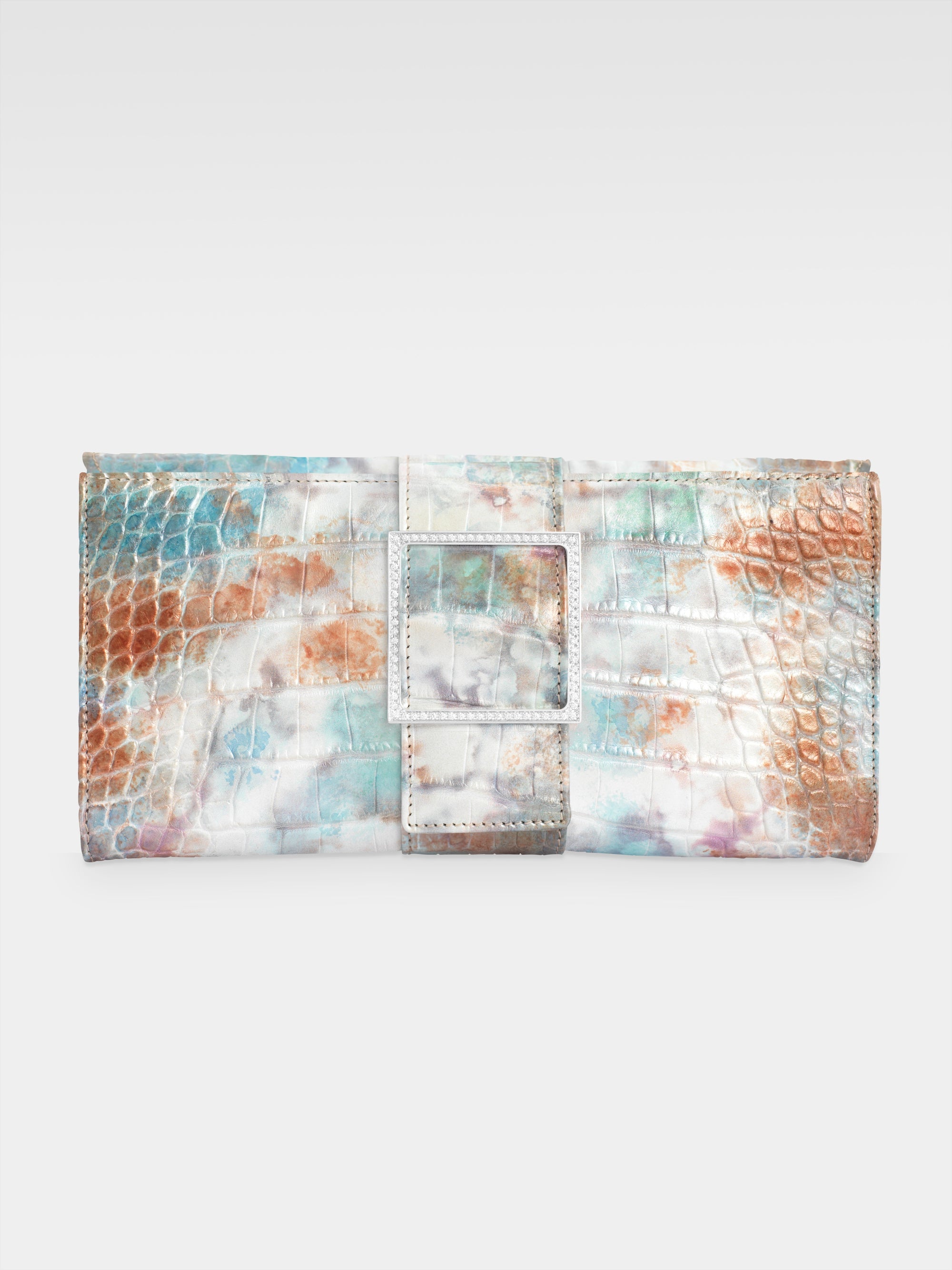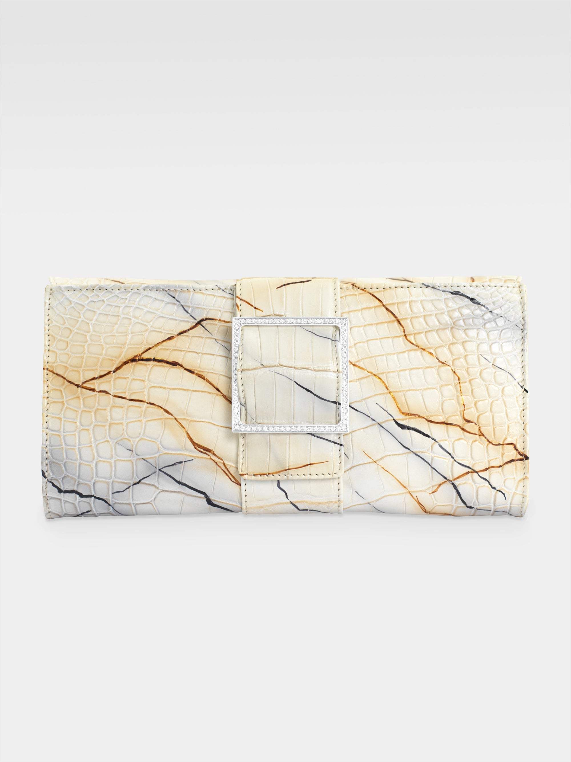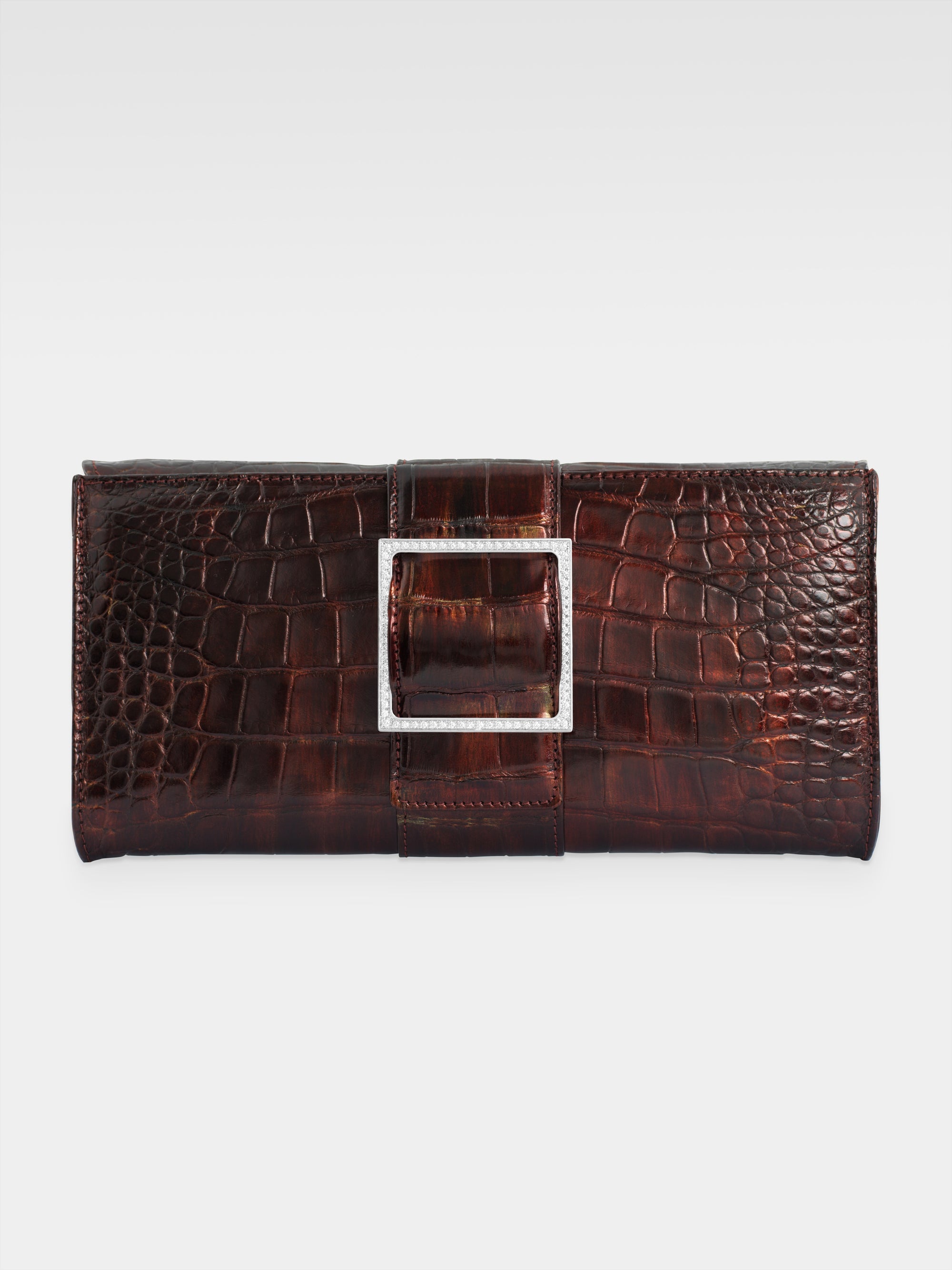 The victory of form over chaos as the origin of the beauty inherent in classical art is the inspiration behind the Sibilla Clutch, the Maison's symbol in which the struggle between opposites achieves harmony in the brilliant geometry of the buckle that stands out against the irregularity of the alligator scales.