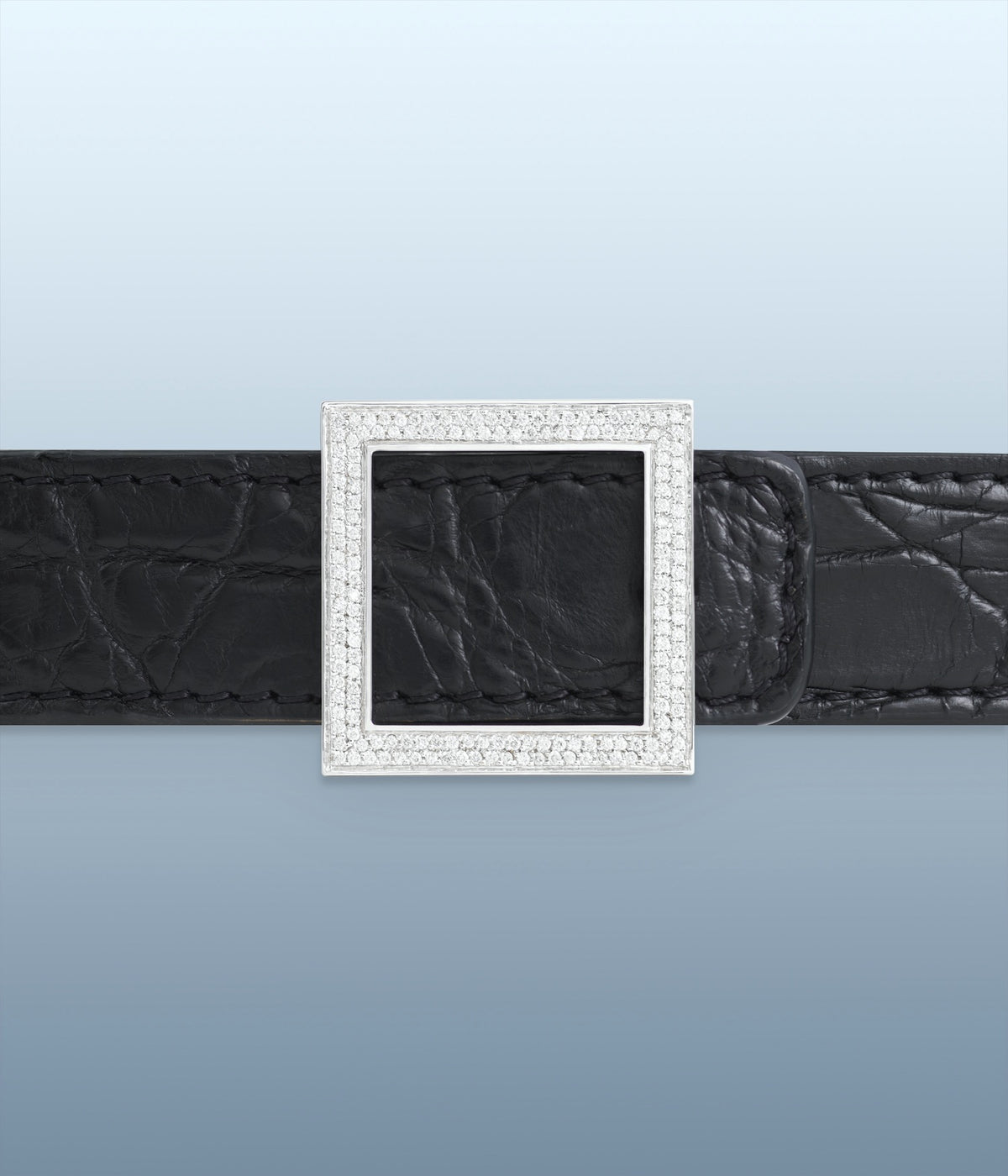 An opulent micro pavè evoking the arrangement of Roman mosaic tesserae composed of pure natural diamonds dazzles on a detachable rectangular 14K white gold buckle that clasps a belt in caiman leather.